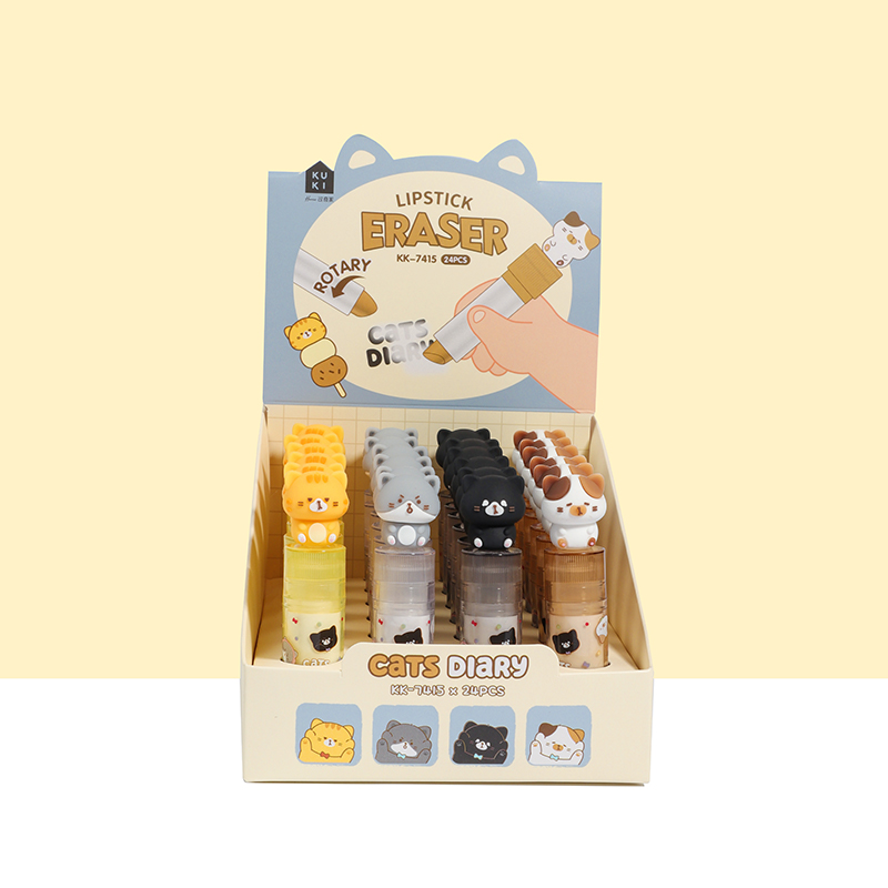 The Lipstick Erasers oleh KUKI memadukan gaya dengan utilitas. Berbentuk seperti tabung lipstik, penghapus ini terbuat dari bahan TPR dan PVC, memastikan sentuhan lembut dan penghapusan yang efektif. Mereka datang dalam berbagai warna dan desain, seperti pilihan dengan motif cakar kucing. Penghapus ini tidak hanya berfungsi tetapi juga berfungsi sebagai aksesori modis bagi pelajar dan profesional. Desainnya yang unik menjadikannya barang menonjol dalam koleksi alat tulis apa pun.